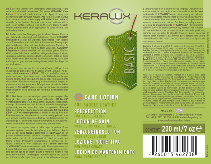 Keralux® Lotion S schenkt dem Leder optimale Rückfettung und Feuchtigkeit. Diese Lotion regeneriert das Wachs- btw. Öl Finish und trägt zu einer langen Lebensdauer des Leders sowie  des Farberhaltes bei.